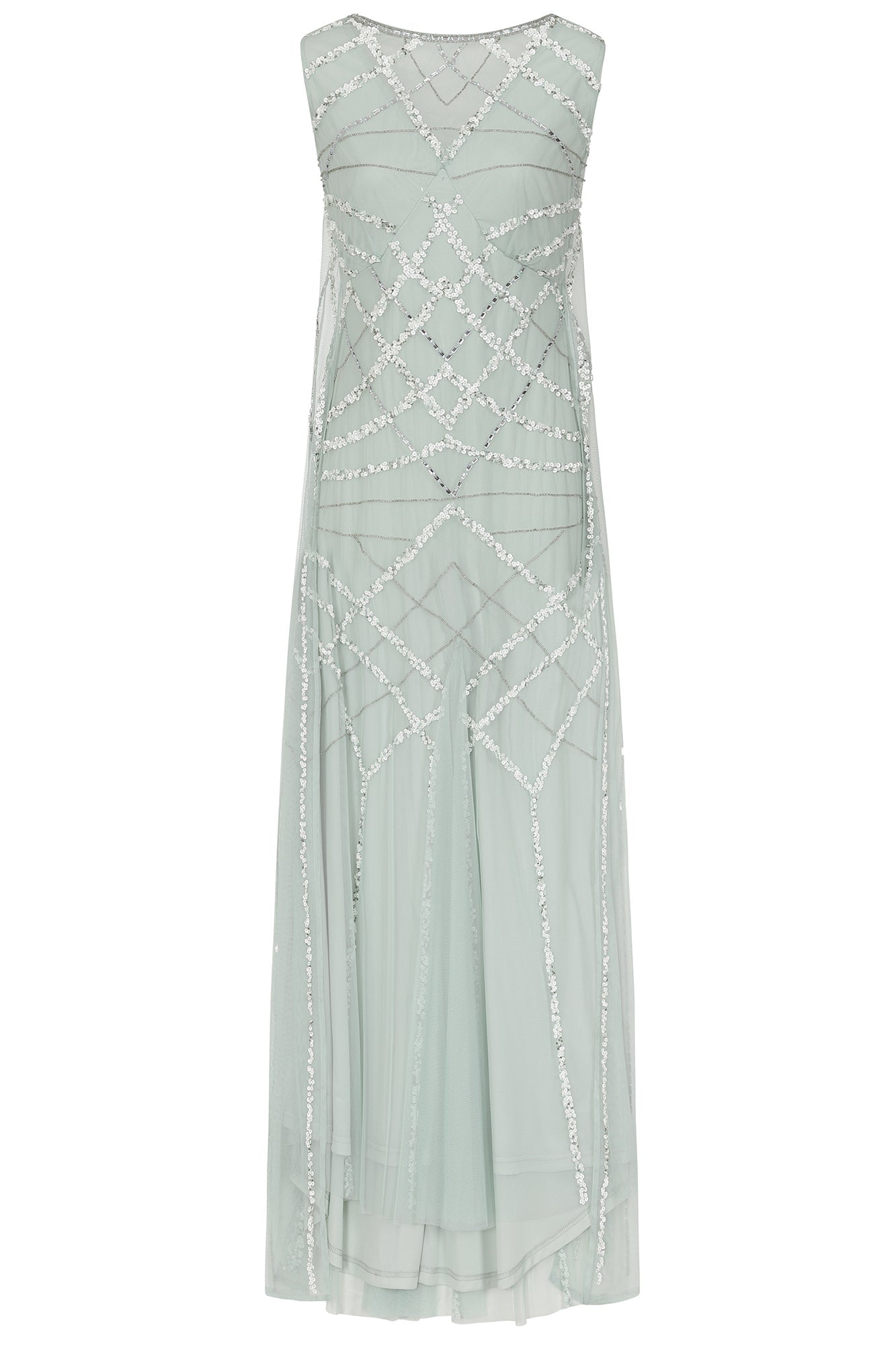 فستان ماكسي باللون الأخضر الفيروزي، مستوحى من حقبة العشرينات بقصة فضفاضة أنيقة. يتميز بطبقة من الشبك الشفاف مزينة بخطوط متقاطعة من الترتر اللامع. بدون أكمام،...