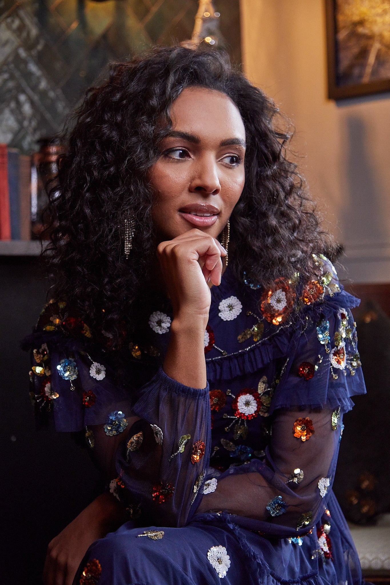 A long sleeved maxi dress that is guaranteed to turn heads, our deep navy Avisa blooms with multicoloured floral embellishment. Perfect for the most important dates in your diary, this full length gown is complete with tiers of whimsical ruffled detailing.